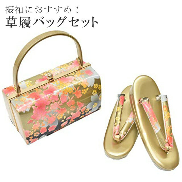【送料無料】草履バッグセット 和装 振袖 ゴールド 黒 合皮 さくら柄 変形丸筒型 ぼかし配色 フリーサイズ 古典柄 振袖用 礼装用 フォーマル 成人式 結婚式 卒業式 袴 振袖 訪問着 小紋 おしゃれ ゾウリバッグ 草履 バッグ 桜柄 和装小物