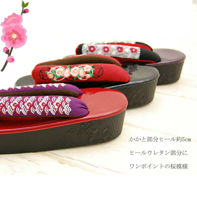 華やか刺繍&ヒール桜柄 ウレタン5cm厚底草履 全3色 Fサイズ シック モード トレンド 花柄 青海波文柄 紫 黒 赤 振袖に 袴に 成人式 卒業式 結婚式 ヒール草履 4fz-02 z