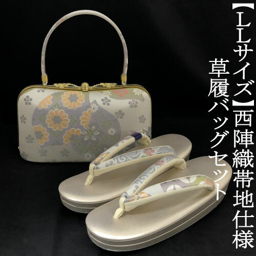 【送料無料】草履バッグセット LLサイズ 西陣織 帯地 LLサイズ 2L 吉祥文様 黒留袖 振袖 礼装用 フォーマル 2枚芯 成人式 結婚式 卒業式 袴 訪問着 留袖 小紋 ゾウリバッグ ぞうり バッグ 草履 シルバー グレー オレンジ グリーン 銀