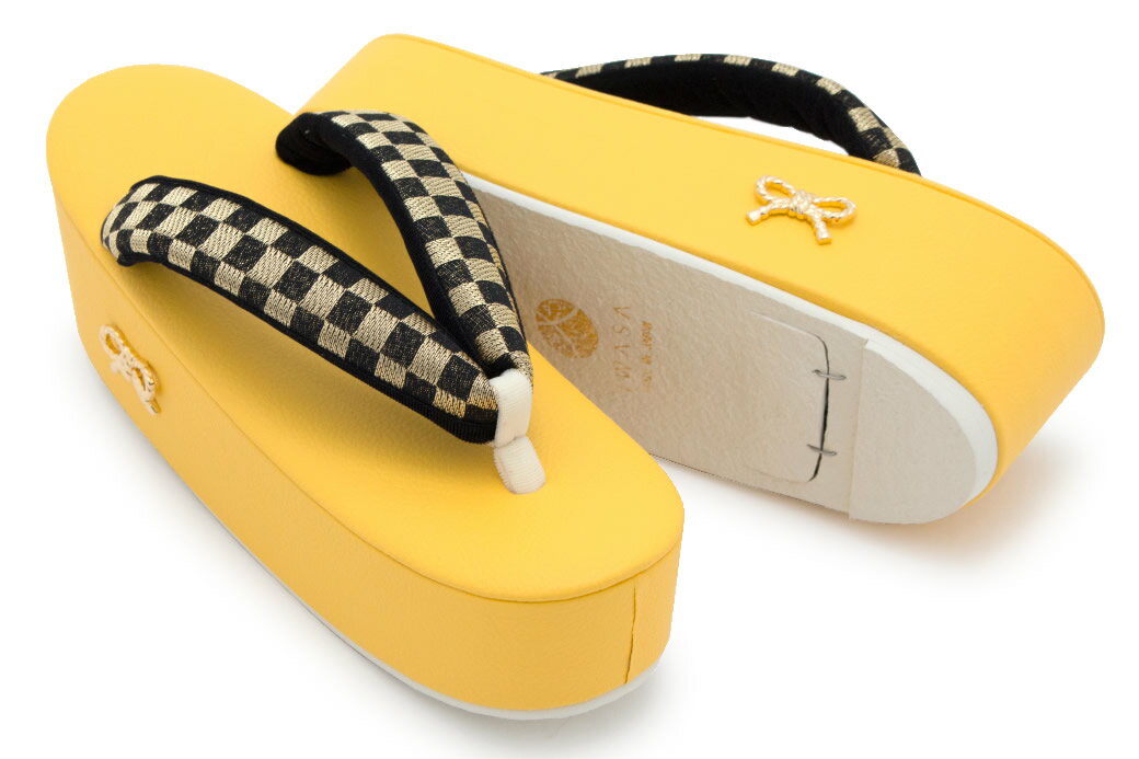 草履 ブランド 岩佐謹製 黄色 イエロー 金 ゴールド 黒 ブラック 市松格子 リボン飾り 厚底 三枚芯 成人式 卒業式 振袖 袴 小紋 色無地 カジュアル フォーマル 日本製 フリーサイズ 【あす楽対応】【送料無料】