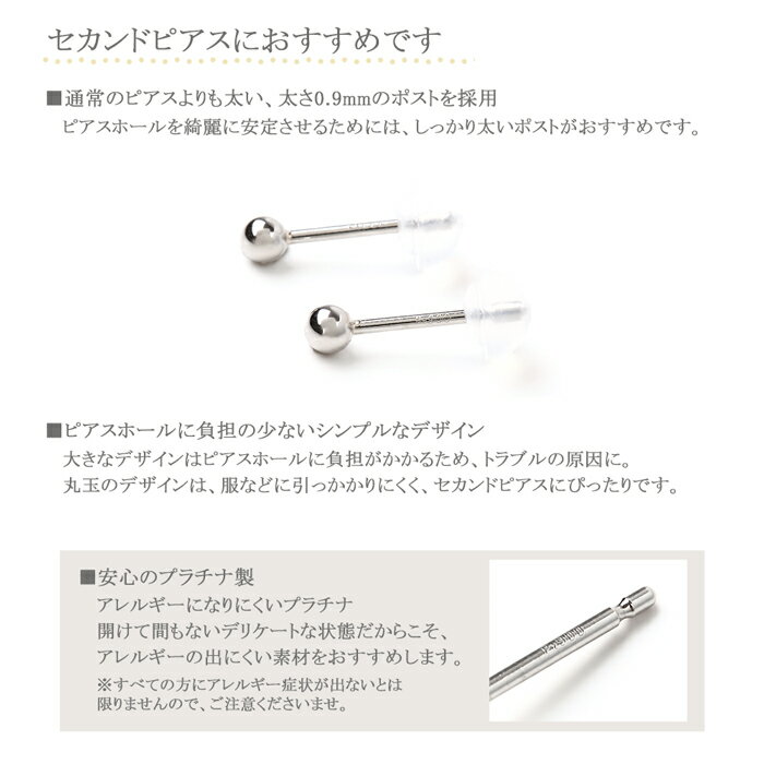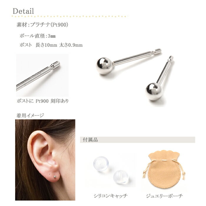 商品説明素材プラチナ刻印 ポスト Pt900サイズ ポストの太さ0.9mm 長さ10mm付属品GUARANTEEカード(品質保証書)ジュエリーポーチ 一言コメント定番の丸玉ピアス ワンランク上の艶、質感をお楽しみください。