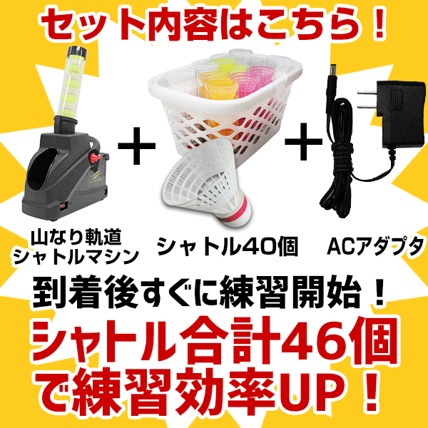 カテゴリトップ > 野球・ソフトボール > 野球特訓道場(野球練習用品) > カテゴリで選べる&探せる!野球練習グッズ一覧 > トス・ピッチングマシン ↓ラッピング(290円/税込)のご注文はコチラ↓ 【検索ワード:ラッピング 贈りもの 贈り物 贈物 贈答品 プレゼント ギフト お祝い 記念品 卒業 卒団】プレゼント交換 ギフトボックス】 商品説明 山なり(トス)軌道のシャトルマシンが豪華3点セットで新登場! シャトル合計46個+アダプター付きで練習効率UP間違いなし!! パートナー不要でシャトル打ちが実現! 段階別で角度・高さが調整できるので、幅広い年代のプレーヤーがお使いいただけます。